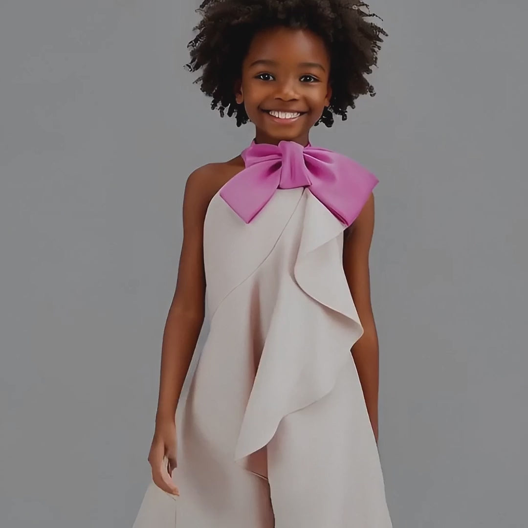 Introduce her to effortless elegance with the Amélise Cascade Bow Dress, a charming design crafted for young style muses who adore movement, softness, and a touch of whimsy. Defined by its sculptural cascading ruffle and an oversized statement bow at the neckline, this dress captures the magic of childhood while elevating every special moment with timeless sophistication. A soft, flowing silhouette ensures comfort and grace from picture-perfect celebrations to elegant family gatherings.
